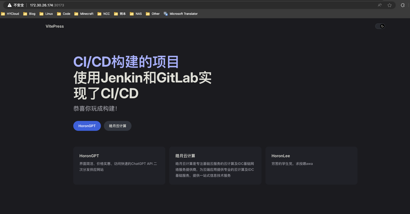 这篇文章是我在学校帮老师写的,旨在于帮助同学更好的学习 kubernetes、使用 Jenkins 软件和理解 CICD 流程,其中 jenkins 和 gitlab-ce 的镜像均可以从 Docker Hub 拉取,项目文件就是我的个人文档HoronDoc,同志们可以自行下载构建(不包含 Dockerfile),或者在我的个人 NAS 上下载VitePressProject(包含 Dockerfile)。下面就是正文了,enjoy:D