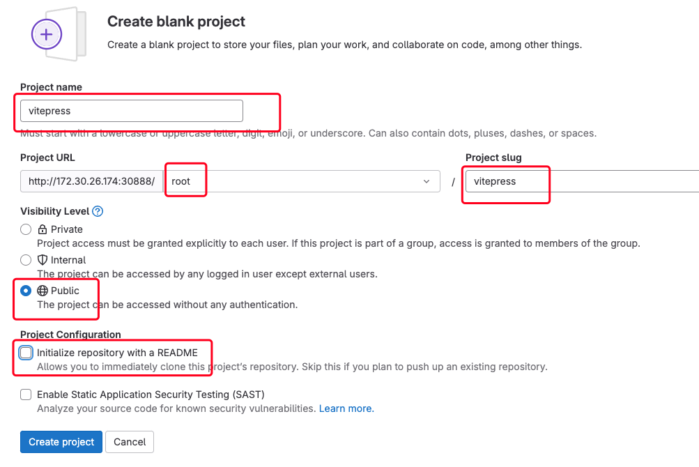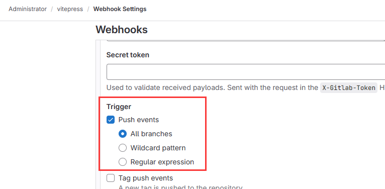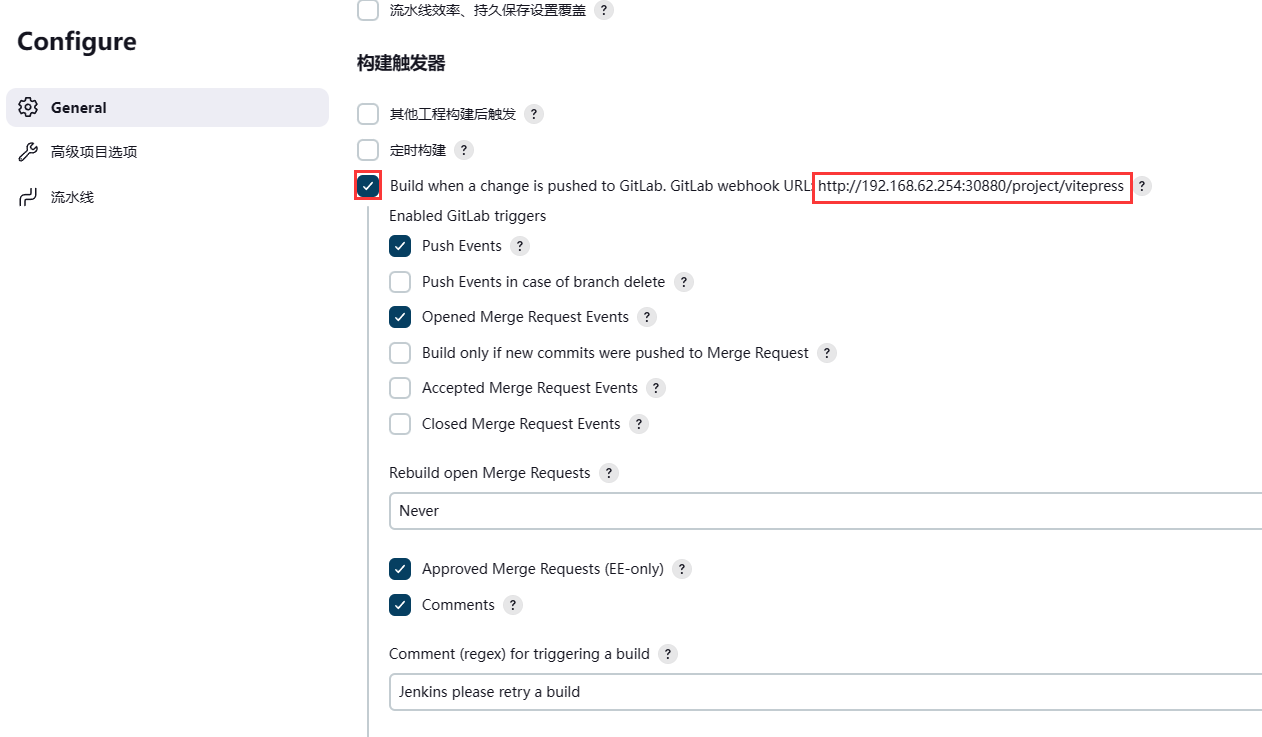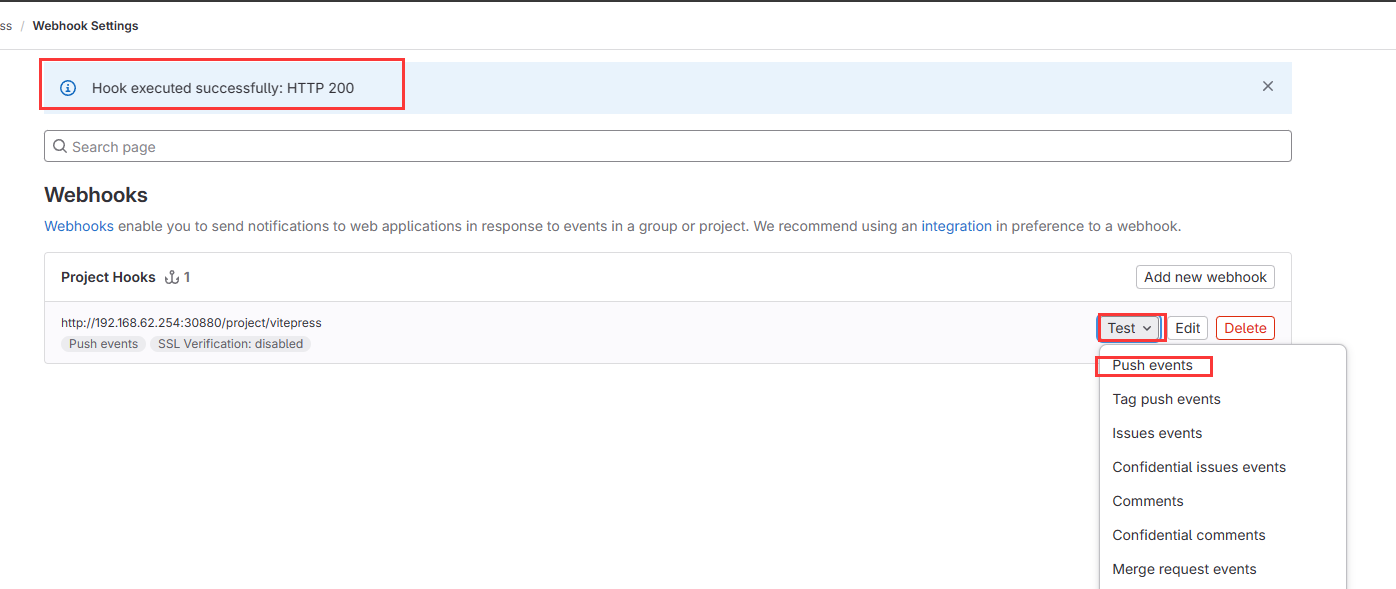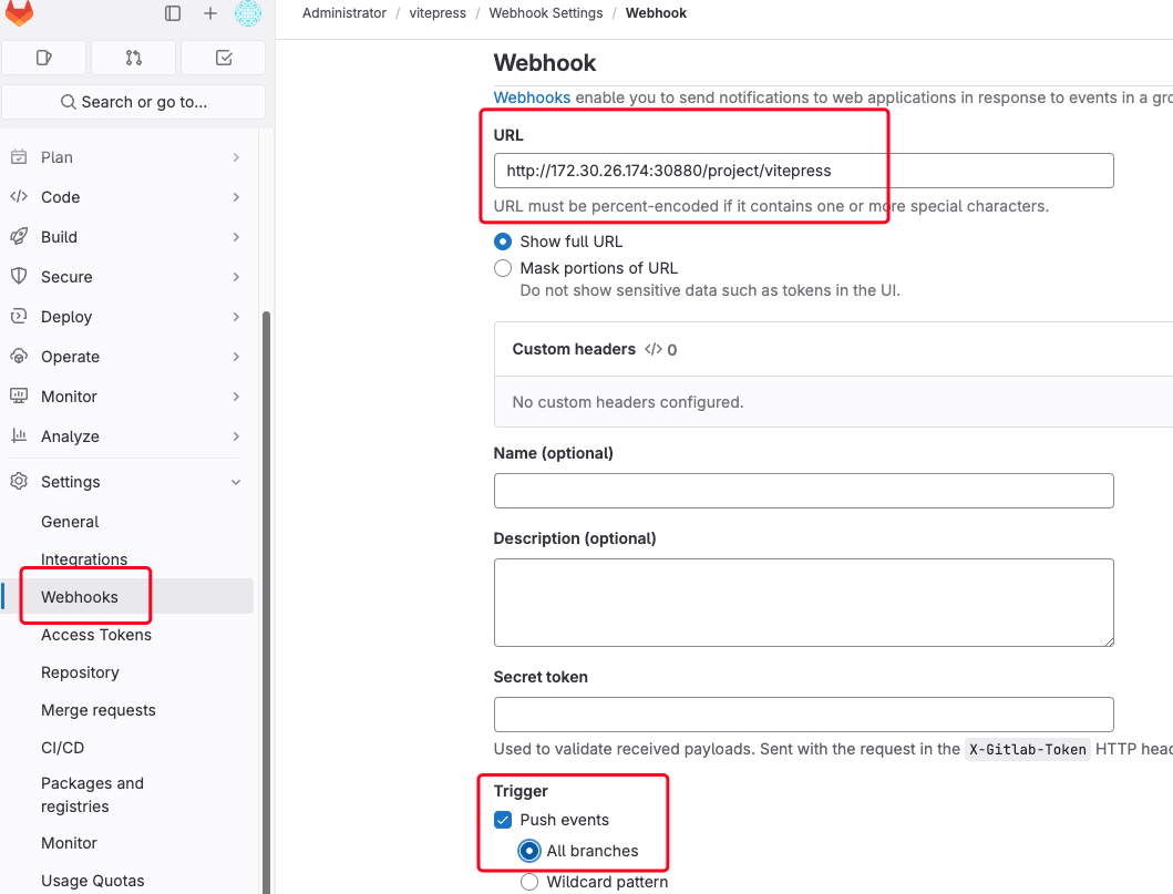 记录下GitLab webhook URL的地址(http://172.30.26.174:30880/project/vitepress),后期配置webhook需要使用。