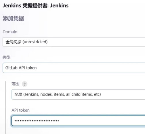 添加Credentials,单击“添加”→“Jenkins”按钮添加认证信息,将Gitlab API Token填入,如图所示: