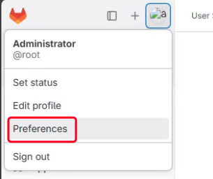 单击GitLab用户头像图标,在左侧导航栏选择“Preferences”,如图所示:
