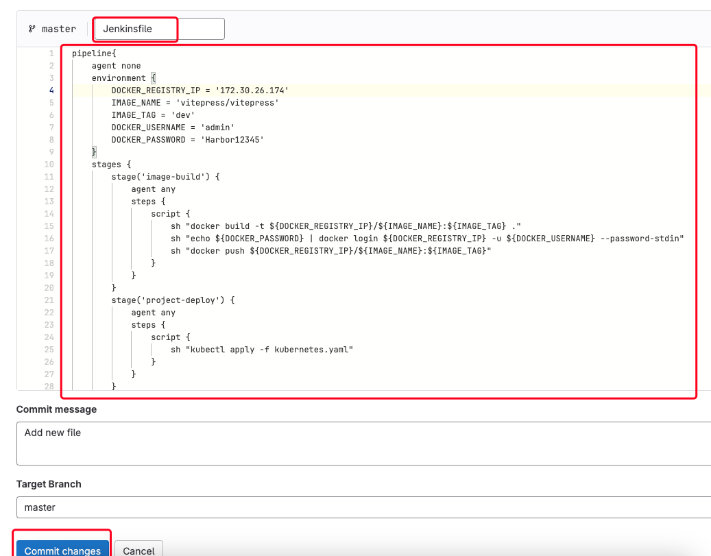 将流水线脚本输入到Jenkinsfile中,更改kubernetes.yaml文件中所使用的镜像的名字,将其harbor.io改为自己harbor仓库的地址,本文是172.30.26.174