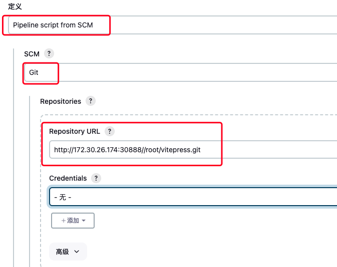 在定义域中选择“Pipeline script from SCM”,此选项指示Jenkins从源代码管理(SCM)仓库获取流水线。在SCM域中选择“Git”,然后输入“Repository URL”