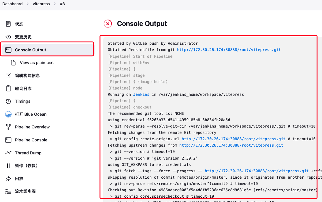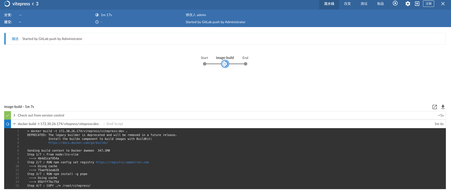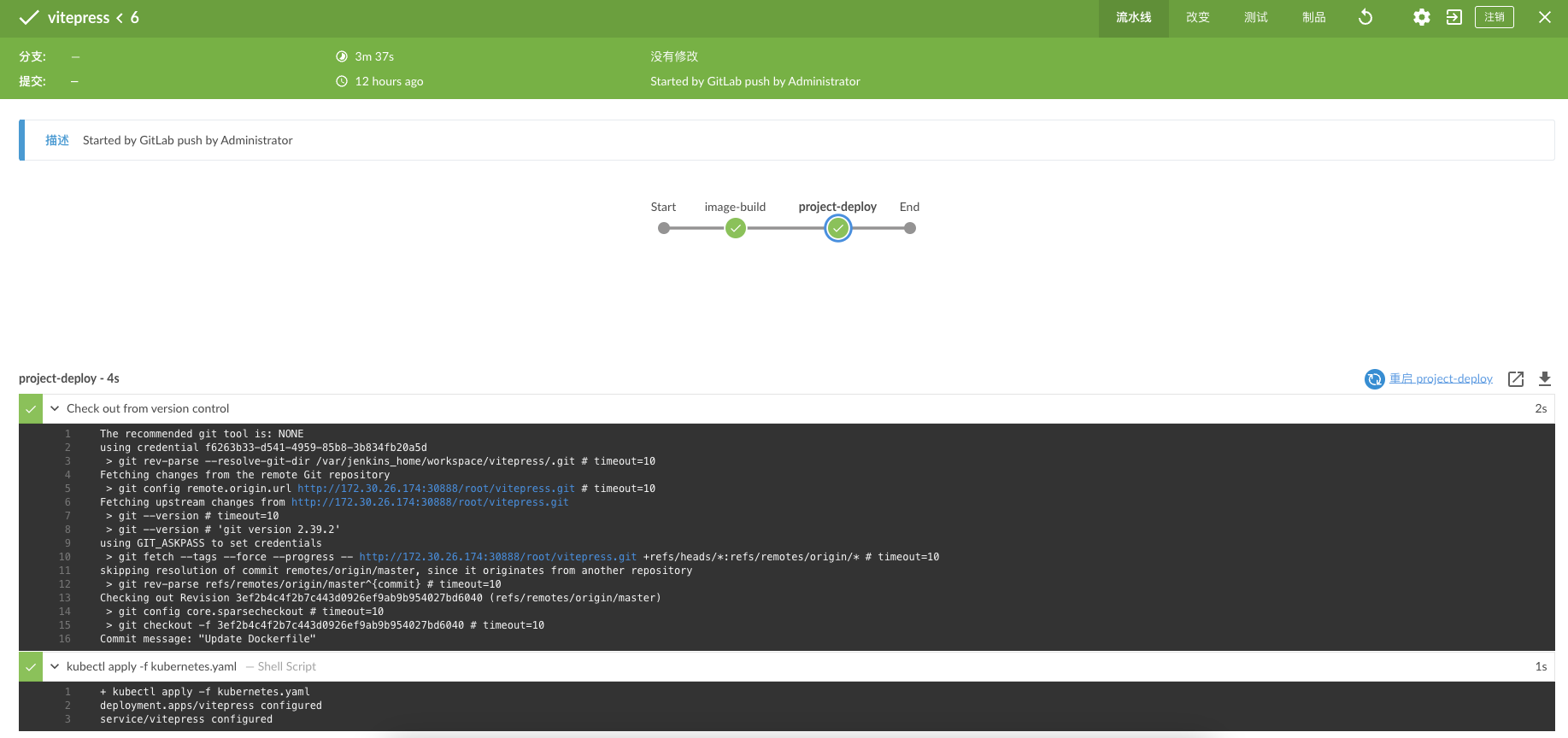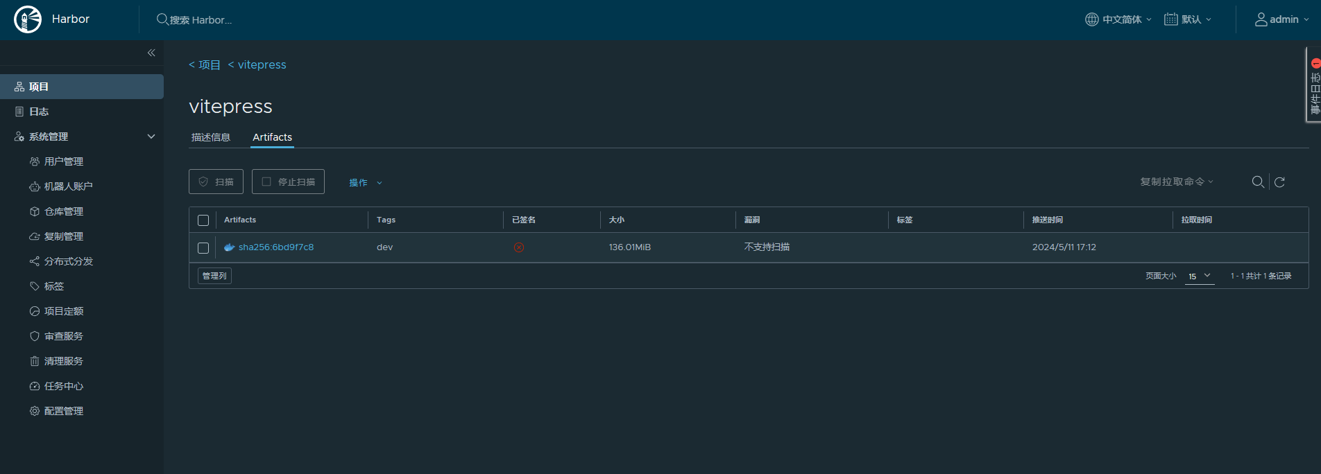 如果构建失败,需要前往 Harbor 仓库删除上传的镜像以及 worker 节点上 ctr -n k8s.io image ls|grep vitepress 显示的所有镜像,再次运行流水线
