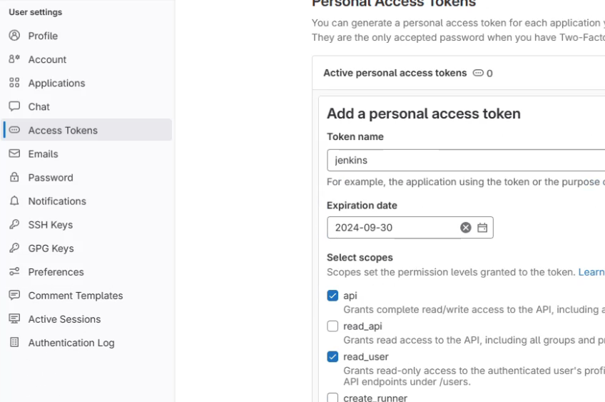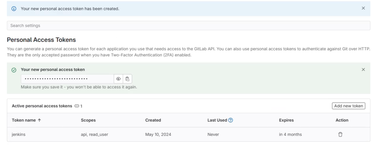记录下Token(glpat-earMgQ66g4SdoMNjJr6e),后面配置Jenkins时会用到。