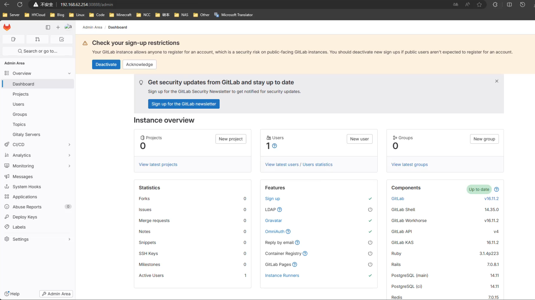 登录Gitlab管理员界面(http://master:30888/admin),如图所示: