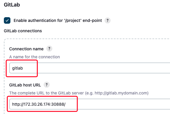 登录Jenkins首页,选择“系统管理→系统配置”,配置GitLab信息,取消勾选“Enable authentiviion for ‘/project’ end-point”,输入“Connection name”和“Gitlab host URL”,如图所示: