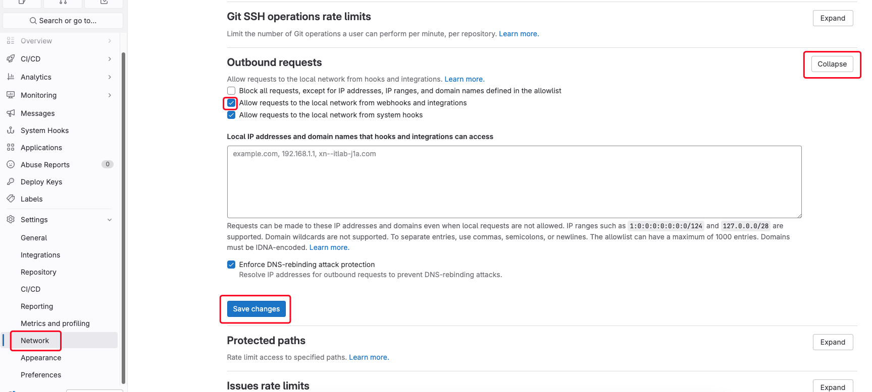 在左侧导航栏选择“Settings→Network”,设置“Outbound requests”,勾选“Allow requests to the local network from web hooks and services”复选框,如图所示: