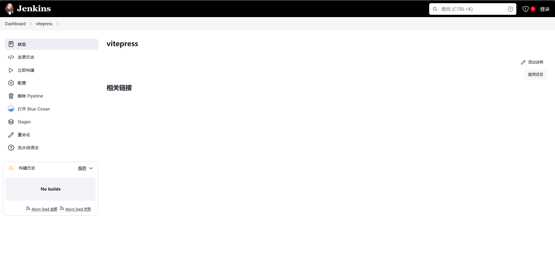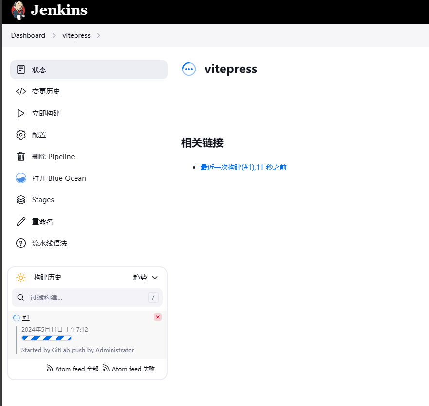登录Jenkins 刷新页面,因为刚才测试了一个提交动作被 webhook 捕捉,所以可以看到vitepress项目已经开始构建